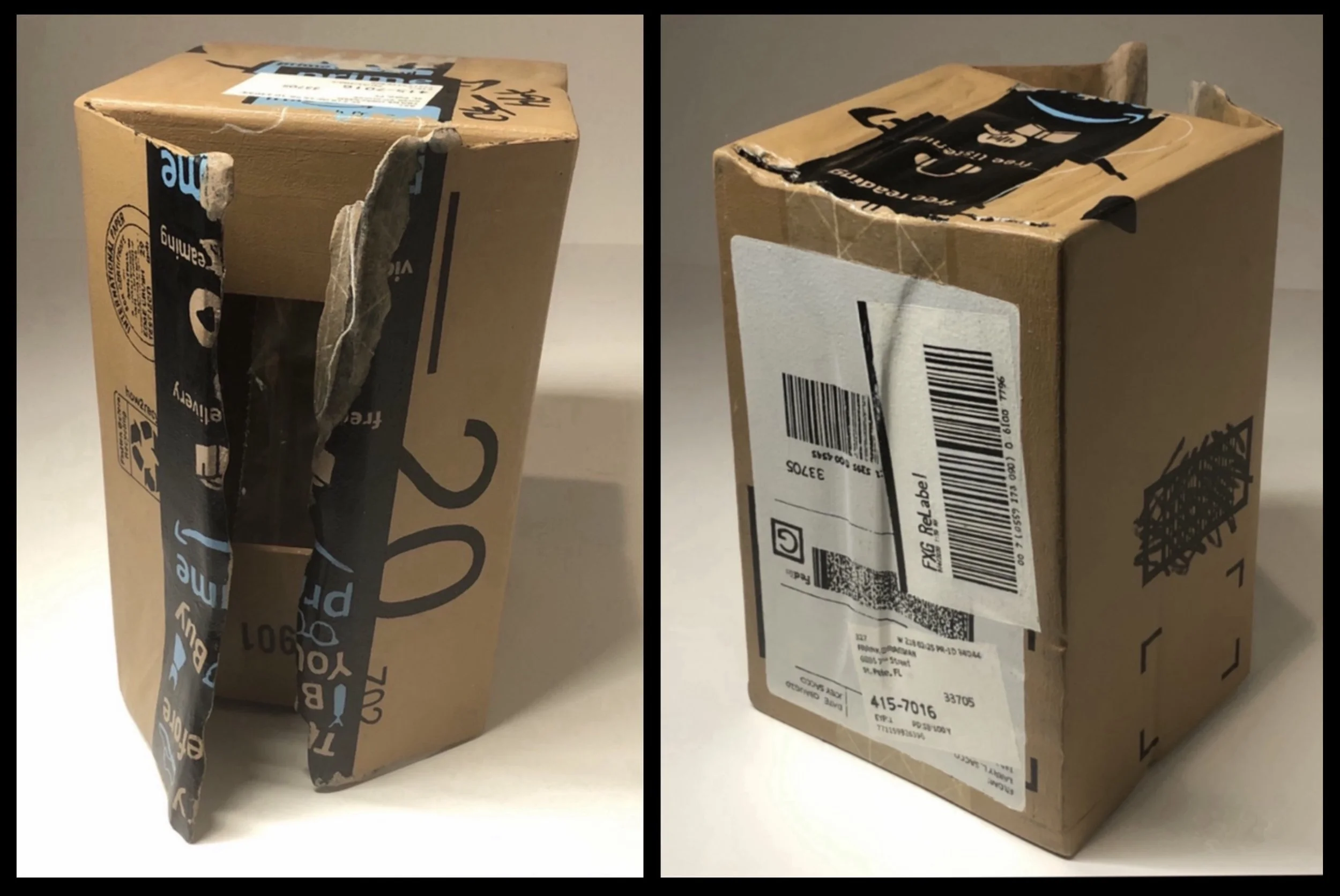 The objects below appear to be boxes (Amazon boxes with one exception) in various stages: unopened, opened, and crushed and discarded. But this appearance is an illusion. Each sculpture is made of wood, carved and shaped to create the appearance of a box, then all details are carefully painted to complete the work of art.
